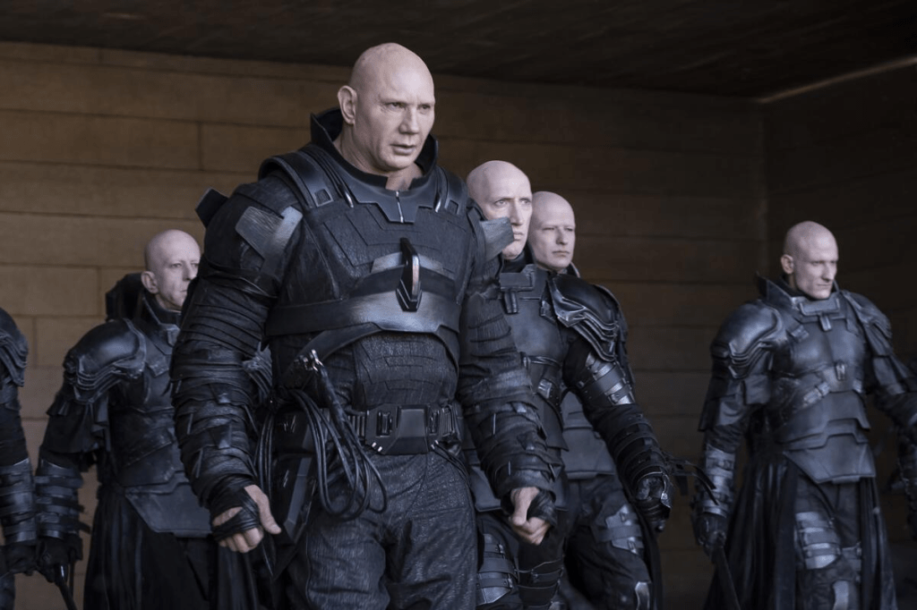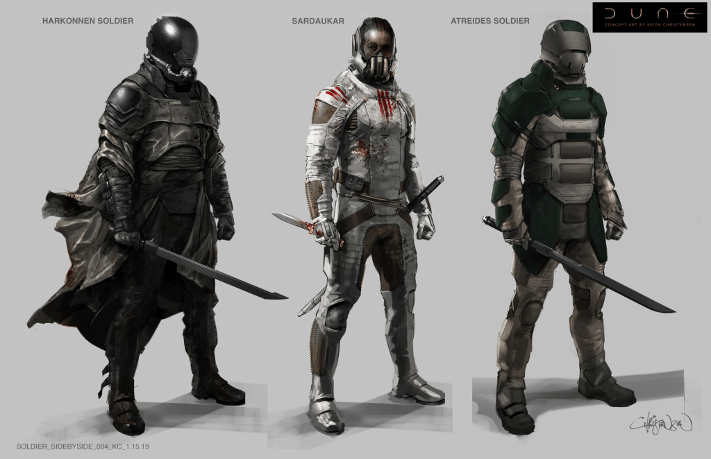 La fazione nemica Harkonnen è invece interpretata con il colore nero, pelle e spandex. Perfino la vasca di rigenerazione del Barone è riempita di un fluido vischioso di questo colore. Il pianeta Giedi Primo è descritto come illuminato da un sole freddo, l’atmosfera del pianeta è inquinata e perciò la luce non raggiunge la superficie. Per questo motivo le scene in cui appaiono i personaggi sul pianeta sono in bianco e nero, mentre se vengono inquadrati altrove risultano molto desaturati. Per l’ideazione dei costumi sono stati presi come moodboard d’ispirazione aracnidi (come la Vedova Nera) e coleotteri per le linee e l’idea di corazza; altri insetti come le formiche per le guardie, in cui distinguiamo una forma familiare negli elmetti.