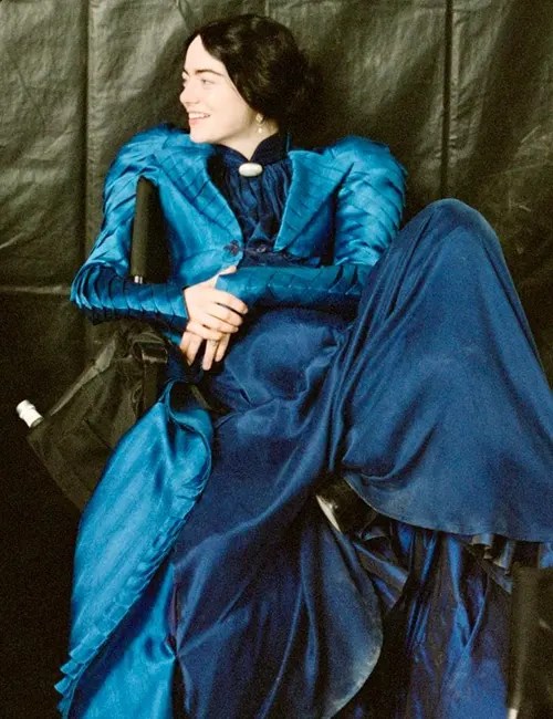 Qui sopra vediamo una scena del film a sinistra, Emma Stone che indossa una bustle skirt per un servizio fotografico e l’attrice sul set con Holly Waddington che le sistema il costume.