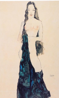 1. Egon Schiele, Nude Girl Standing With Long Black Hair & Blue-Black Drape, 1911, matita e acquerello, ubicazione sconosciuta, tratto dall’archivio fotografico della Columbia University, Stati Uniti.