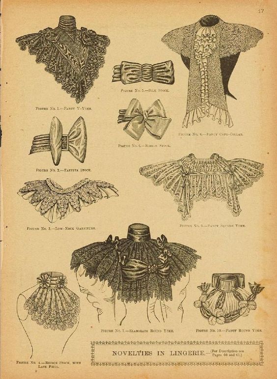 Esempi presi da pagine di magazine di moda di vari ornamenti per il collo e le spalle: vediamo dei jabot in pizzo, fichu, colletti con nodo a farfalla e accessori in pizzo per il petto.