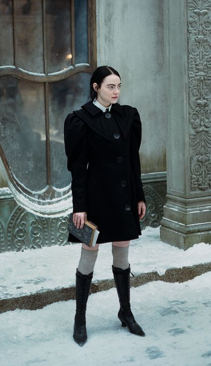 Mentre lavora nel bordello, Bella approfondisce i suoi studi di filosofia e inizia a partecipare a incontri socialisti, indossando un cappotto scuro e stivali che rappresentano un netto cambiamento rispetto ai suoi look precedenti, ma conservando comunque il suo tocco giocoso, irriverente e della lunghezza di una minigonna: hint al simbolo in ambito vestimentario dell’emancipazione femminile. Harry e Martha l’hanno avviata nel suo viaggio intellettuale sulla crociera e poi è andata a tutto gas scoprendo cosa voleva fare della sua vita. Vede la baraccopoli e vuole diventare un medico. Ha attraversato molte vicende e alla fine è arrivata a sé stessa. A causa di dove si trova nella fase di sviluppo, i vestiti sono spesso messi insieme in questo modo molto discordante ma in questo punto del film, non si preoccupa più dei vestiti perché sta ripassando per i suoi esami: si veste di conseguenza, adottando una mise adatta al suo nuovo ruolo.La vediamo con un giaccone francese dell’epoca, che indossa con gambe nude e stivali vittoriani o con indosso un maglione molto morbido e dai toni moderni “nella vetrina di New York di Schiaparelli ce n’era uno uguale” ha detto la Waddington. Anche se sembra più formale, la sua personalità unica continua a emergere, dimostrando che è ancora la stessa Bella di sempre.