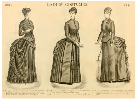 Nelle immagini qui sopra vediamo due pagine di magazine di moda: nella prima immagine vediamo dei modelli del 1886-87 e successivamente del 1896. Appare evidente come il volume dell’abito si sia spostato dalla gonna alle maniche.