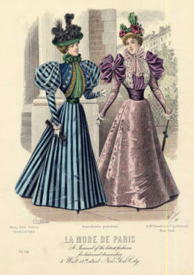 Il cambiamento di stile che caratterizzava l’abbigliamento degli anni ’90 del 1800 rispetto agli anni ’80 era un cambiamento di enfasi dalla gonna al corpetto. La gonna, con la sua complessità di drappeggi, che era stata il principale elemento dell’abito tra il 1875 e il 1889, divenne “scarna e poco importante” come scritto su un giornale del 1890. A partire dal 1886, le gonne divennero sempre meno adornate, i loro drappeggi cadevano in linee più semplici ma, ad eccezione degli abiti più severi e fatti su misura per la campagna e l’attività fisica, la forma doppia della gonna con una sopraggonna decorata rimase in vigore fino al 1889. Negli anni ’90, questa forma scomparve dagli abiti da giorno e dagli abiti più formali e elaborati un anno o due più tardi. La gonna aderiva strettamente in vita; la pienezza cadeva tutta dal centro dietro, senza alcun busto o sostegno in acciaio, semplice e non decorata, in una linea fluida fino a terra. Fu questa nuova linea della gonna che rappresentò il cambiamento importante degli anni ’90, anche se era il corpetto che riceveva ora l’attenzione della Moda. Generalmente, il corpetto rimase una forma rigida, simile a un corsetto. Non ci fu alcuna liberazione del corpo femminile e sue stecche e le misurazioni della vita dei corpetti degli anni ’90 erano piccole come in qualsiasi altro periodo del secolo. Negli abiti da giorno, il colletto eretto degli anni ’80, che era diventato più alto nel 1890, divenne ancora più alto, di due pollici o più, alla fine degli anni ’90, e rimase alto anche nel nuovo secolo. Dal 1890 al 1892, le maniche erano strette con un piccolo sbuffo che si elevava al di sopra del livello della spalla, che era già apparso nel 1889. Dal 1892, la parte superiore della manica cominciò a gonfiarsi e ad allargarsi sempre di più fino al 1896.