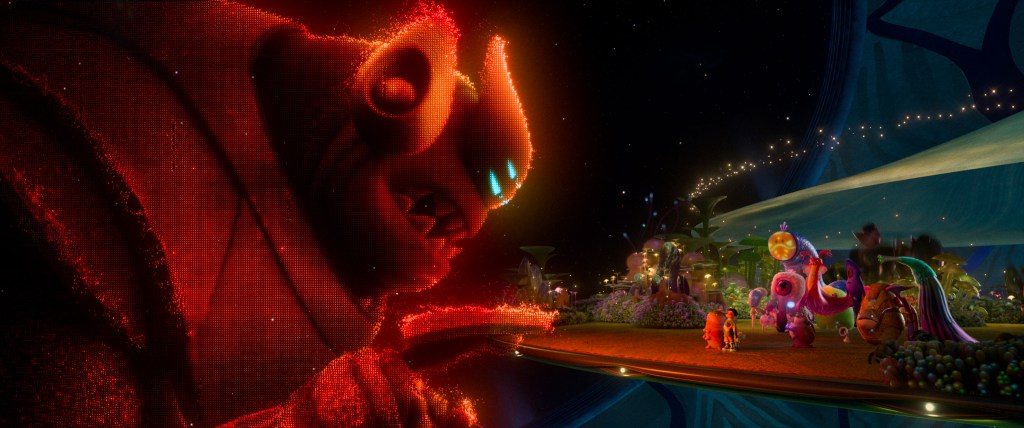 Ad aiutare lo spettatore in questa ricerca di risposte, ci viene incontro un cast stellare di personaggi, vera linfa vitale del film. E’ risaputo quanto la Pixar sia incapace di sbagliare nella realizzazione delle figure e degli ambienti che popolano i suoi film, e questo è quanto mai vero in Elio. C’è una cura maniacale nella costruzione delle ambientazioni, i cui dettagli risaltano nel contrasto tra gli scenari terresti e quelli alieni: sulla Terra gran parte delle scene è ambientata all’interno della base militare in cui zia Olga lavora ed è dominata da uno stile architettonico brutalista, con edifici squadrati, grigi e ripetitivi. Nel Comuniverso, al contrario le costruzioni tendono alla linea curva, a superfici traslucide e ad una varietà cromatica eccezionale, che rendono il luogo una continua sede di prodigio e meraviglia.